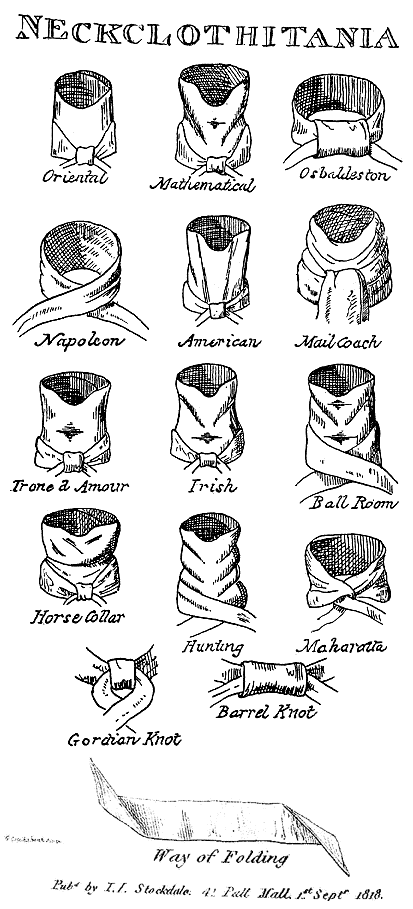Not so the Regency rake! His valet was under much more pressure to make his master presentable and indeed, even to shine above the rest and be perceived as unique. Instead of a couple of basic ways to tie that already nicely formed strip of silk that’s decorated in a rank suitable fashion, the Regency buck (or at least his man) was expected to be familiar with a far more numerous array of styles.